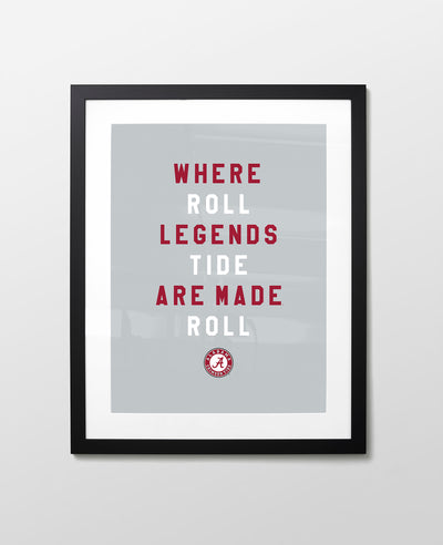 Pay homage to the Crimson Tide with a typographic tribute of “Where Legends Are Made” and “Roll Tide Roll.” This clever mix of type and color is sure to give you a double dose of school pride.