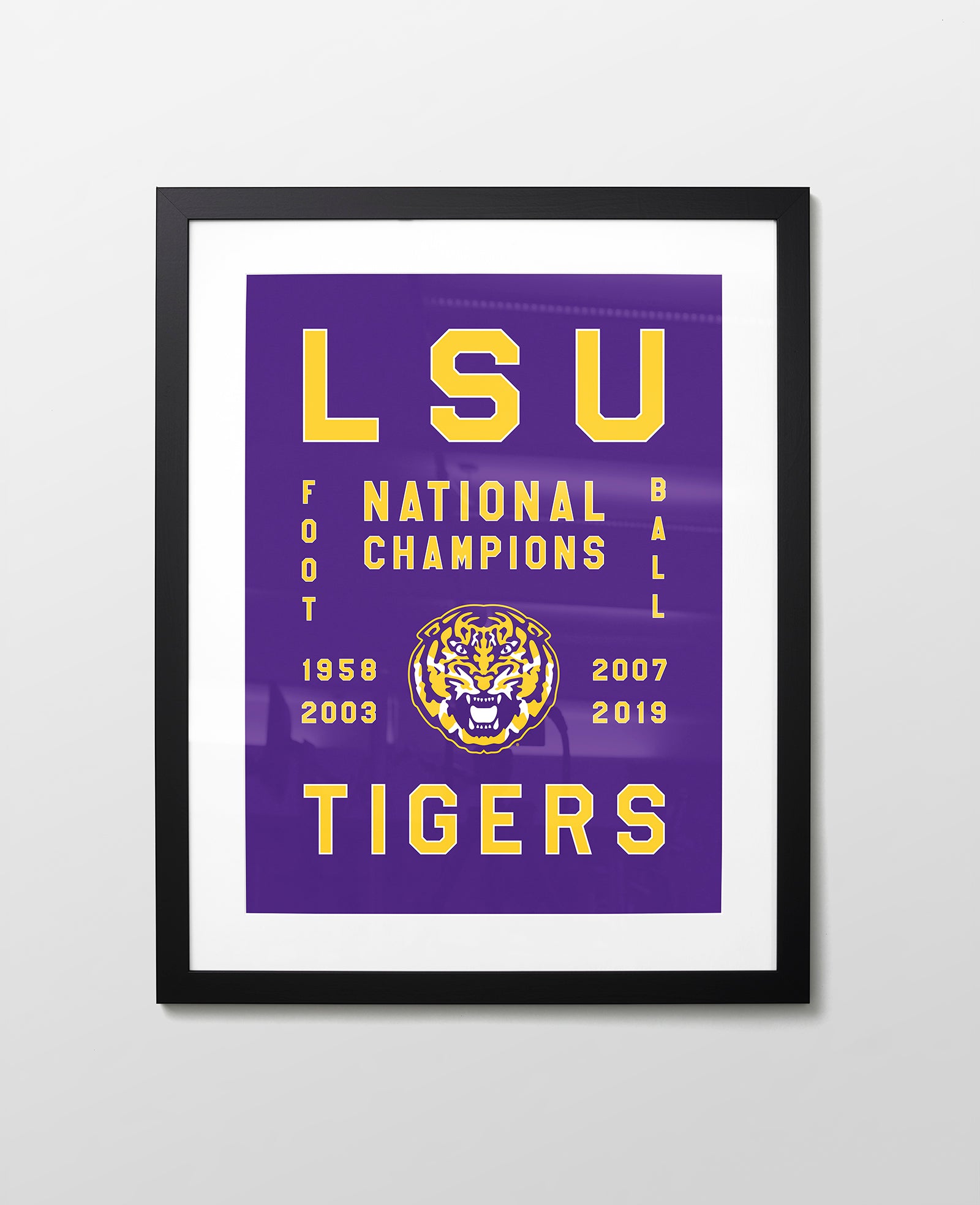 What better way to honor the storied history of LSU Football than with this inspired design. Taking a cue from vintage championship banners, it’s a worthy tribute to a program with four national titles (and counting)! Geaux Tigers!